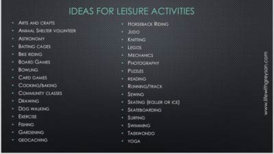 Consider any physical or cognitive requirements of the learner first, and then you are only limited by your own imagination. Keep in mind one person’s leisure, might be another persons work (aka- me and cooking. No thank you.). It’s important that the activity doesn’t only feel like work for it to be a good choice for an individual.