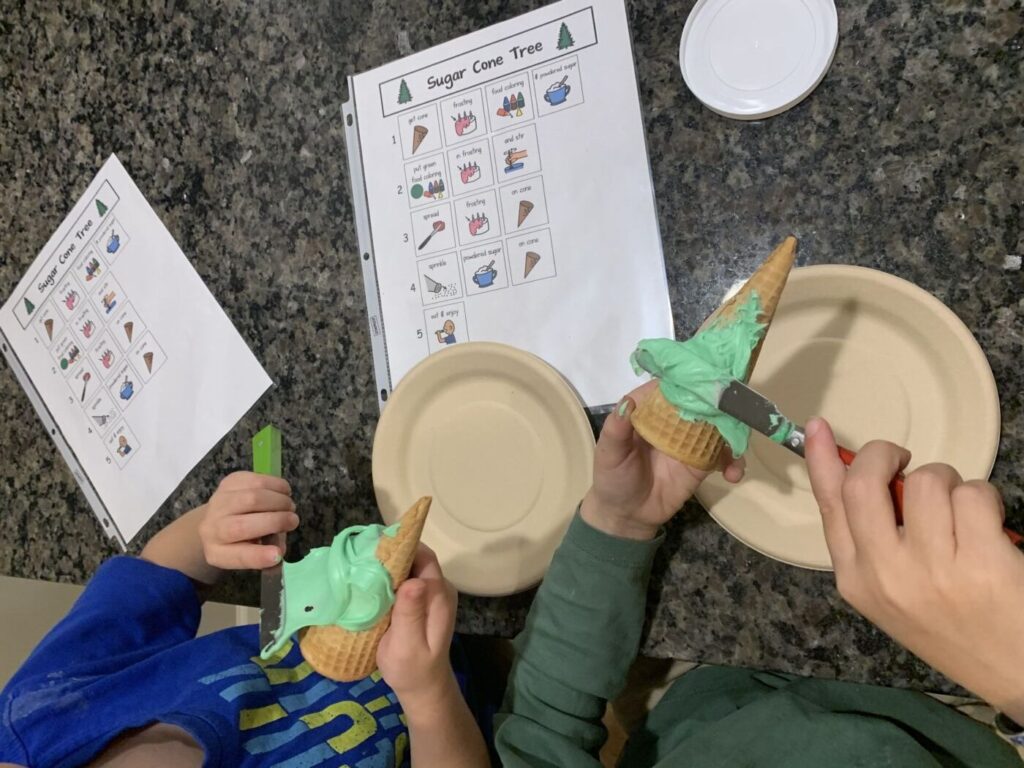 Tip: Add a small dab of icing on their fingers as they explore the ingredients. It keeps the process playful and helps them stay engaged. We even added sprinkles as “ornaments” for our trees. Expect some mess but lean into the fun—it’s worth it! You can find this visual recipe here!