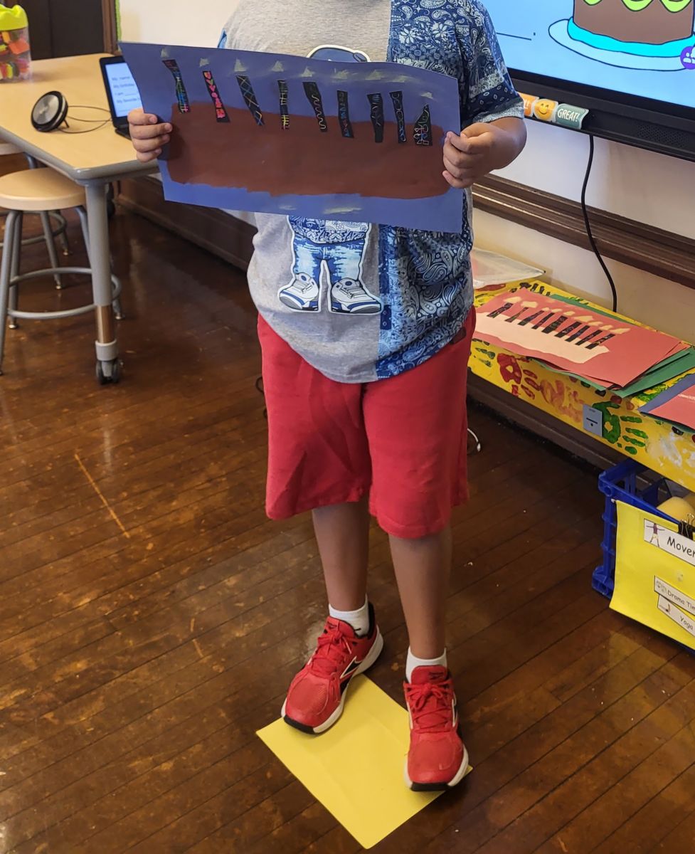 We created some birthday cake art as part of our unit. Our art project incorporated the different writing utensils we learned about the Reading A-to-Z book Write!. We painted the cake shape using a brush. Students chose between “chocolate” (brown paint) and “vanilla” (peach-colored paint). Then students cut candles out of scratch paper (based on their age), glued it to the cake and used a stick to scratch designs in the candles. Finally, students drew a flame using chalk and smudged the flame with their fingers to create a softer smokey effect. Of course, students shared their art by presenting in front of the class, working on their speaking and presentation skills.