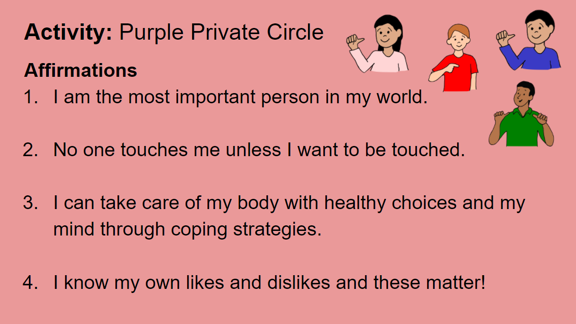 Sharing in the remote setting has really helped my students expand their verbal skills. Having students share about feelings, accomplishments and what they have learned is helpful in developing self-compassion. When students share what they have done during small groups, it gives me the opportunity to highlight what they have been learning and reassure students that they are making progress when learning feels difficult. In the “Purple Private Circle” lesson, I had students share about what makes them feel important or special. I plan on teaching the lesson again and have them share about hobbies or what they do to take care of themselves. This lesson is a good jumping off-point for continuing life skills instruction and covering content such as healthy eating and hygiene. This is another area that can be repeated, especially if you are using the Circles visual with the colors and the different pictures of people placed in the appropriate areas.