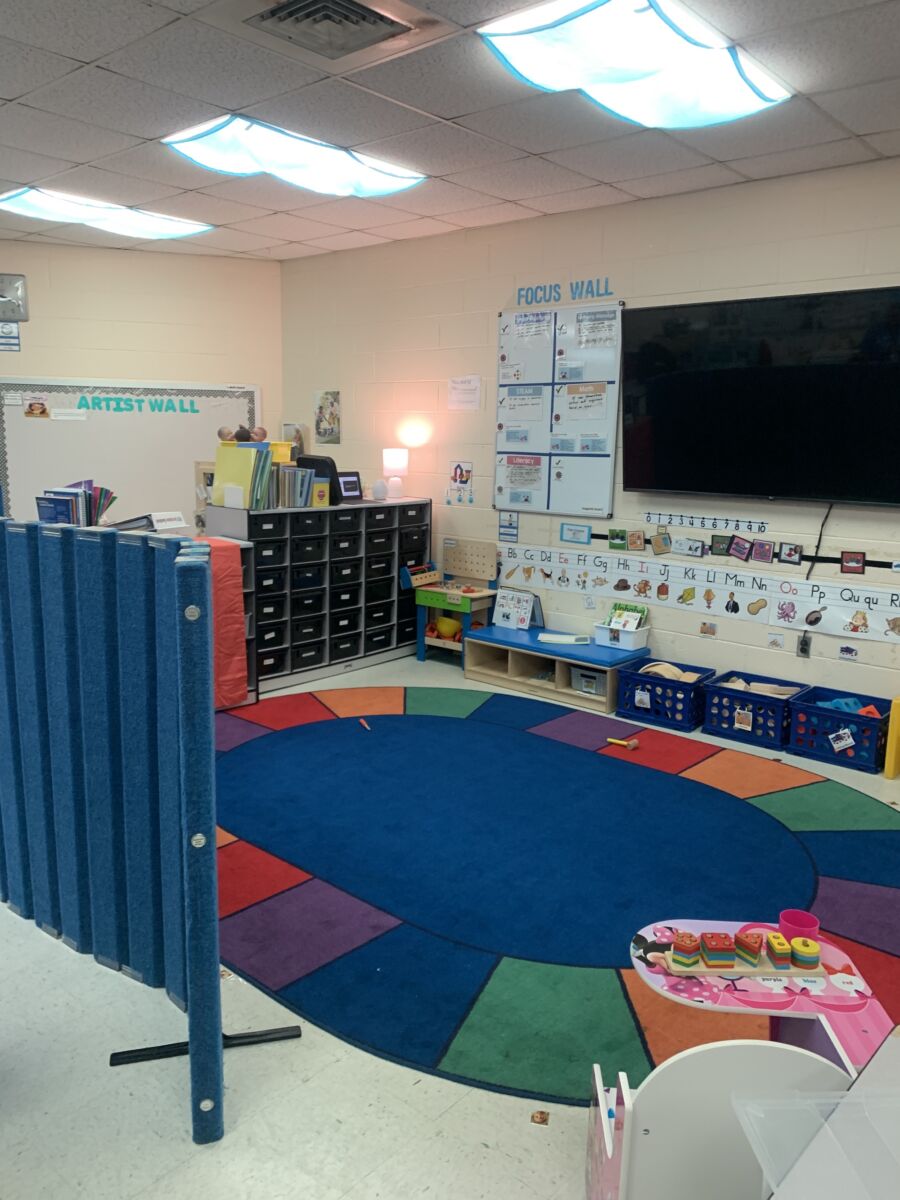Use visual boundaries (like rugs, shelving, or dividers) to define each area of the room — circle time, work with teacher, centers, break area, etc. One of my favorite tools this teacher used is a large freestanding sound divider during whole-group time. Not only does it help with acoustics, but it subtly separates the space, giving the group area a designated “feel” without adding visual clutter.
