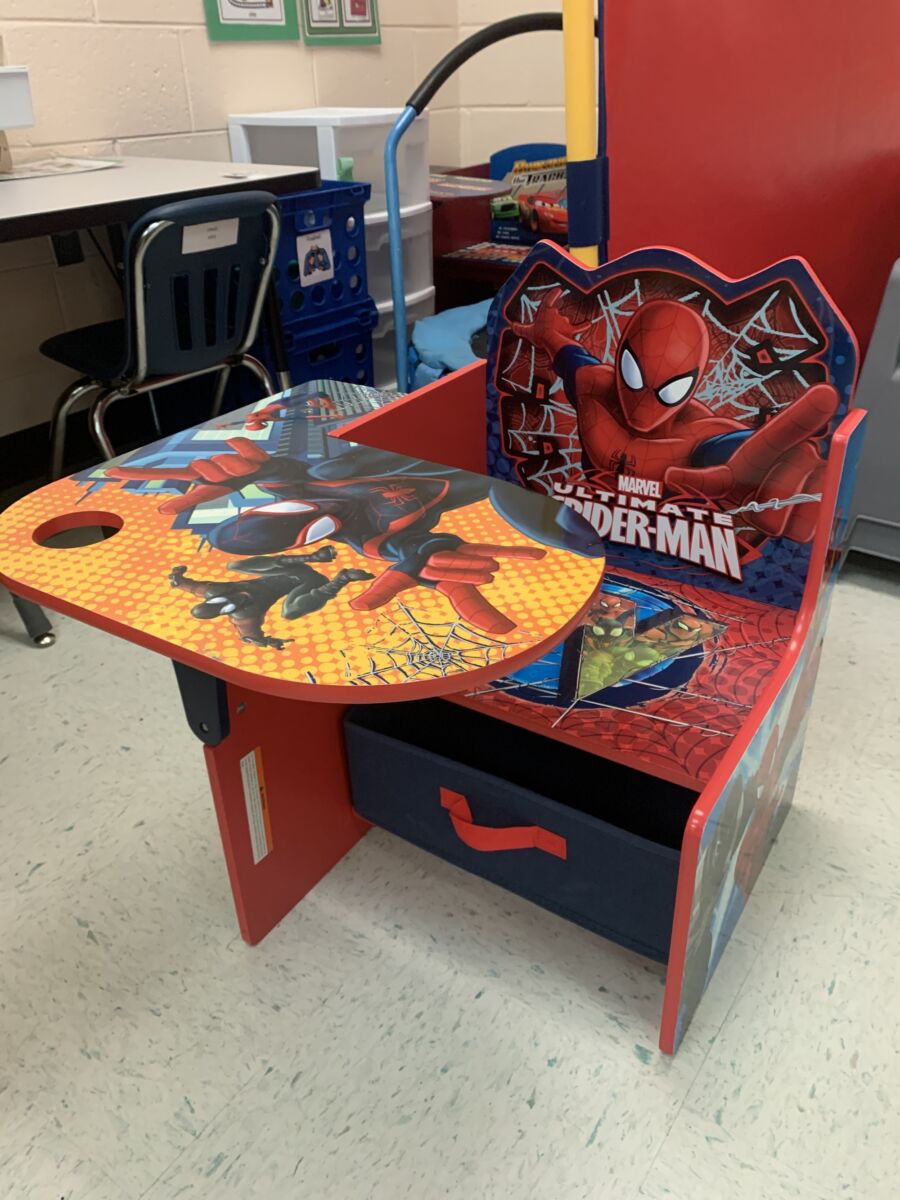 When I walked into this classroom, my eyes instantly went to these two themed seats — a Minnie Mouse desk and a Spider-Man desk — and let me tell you, they’ve been a huge hit (you can find them on Amazon). Beyond being appealing to her young students, they provide: